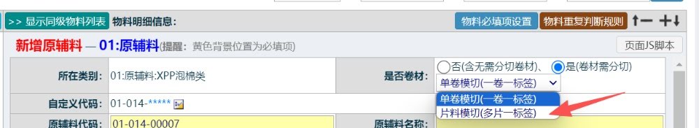 首先资料需创建(修改)成卷料属性按片料管理