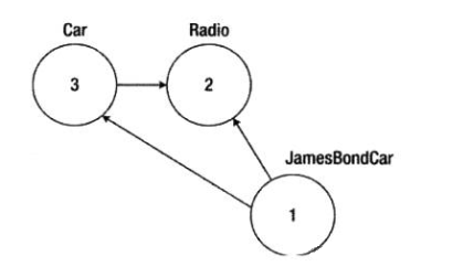 [JamesBondCar 1, ref 3, ref 2] =》 对象1(JamesBondCar类)依赖于对象3和对象2。