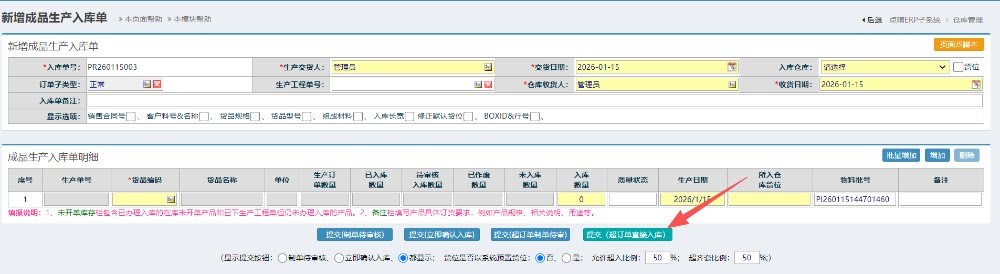 在新增成品生产入库单时,需要点击下方的的提交(超订单直接入库),同时需要设置对应的超入比例才能进行入库。