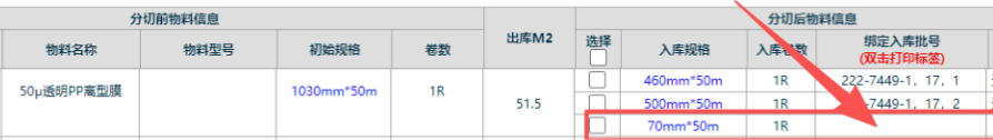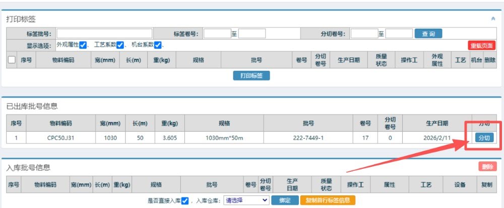 进入界面后,点击“分切”按钮,复制对应的标签数量,选择对应的入库仓位,点击绑定按钮,完成
