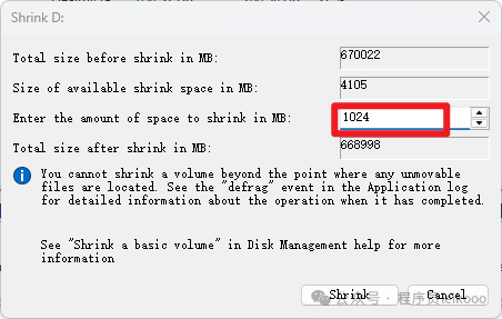 然后点击 Shrink (压缩)就可以发现这里有一个灰色的区域