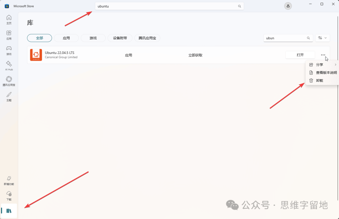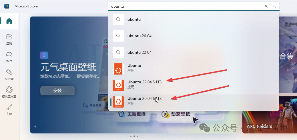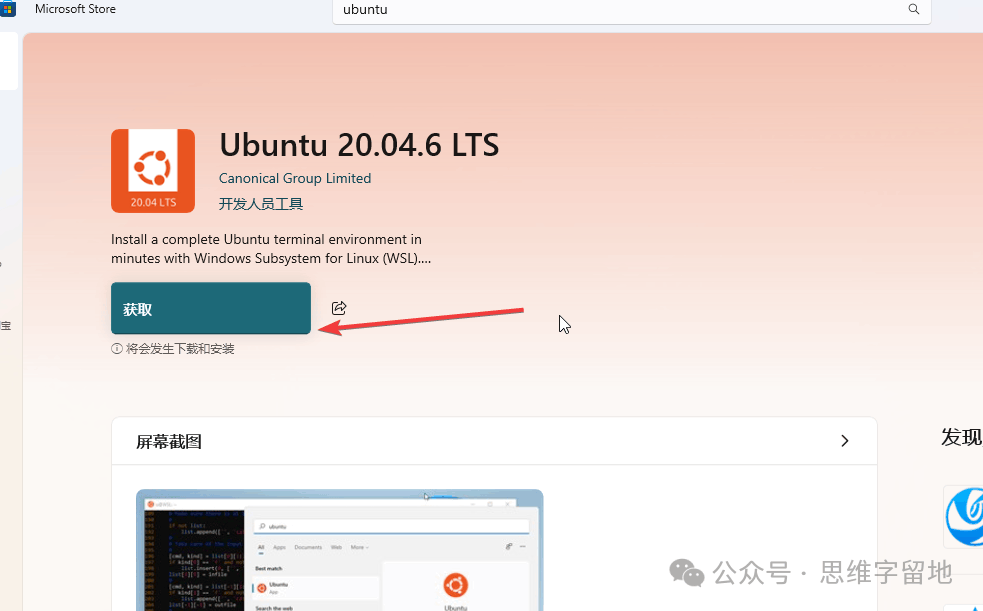 然后,搜索Ubuntu,选择其中一个开始安装。插句题外话:安装任何工具,建议安装带有 LTS 后缀的版本,因为这是官方发布的、长期维护的版本。