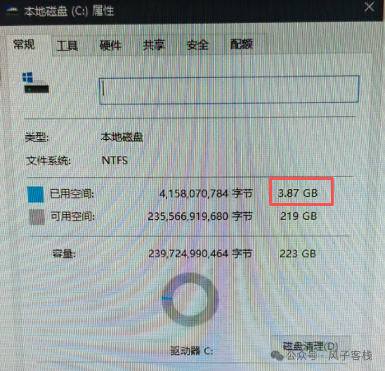 赶紧点开C盘看占用:3.87G!没看错,就是3.87G