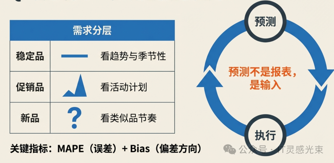 • 用“预测-执行”闭环:预测不是报表,是要进入计划与采购的输入