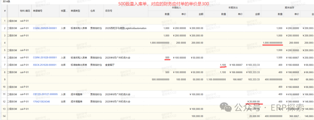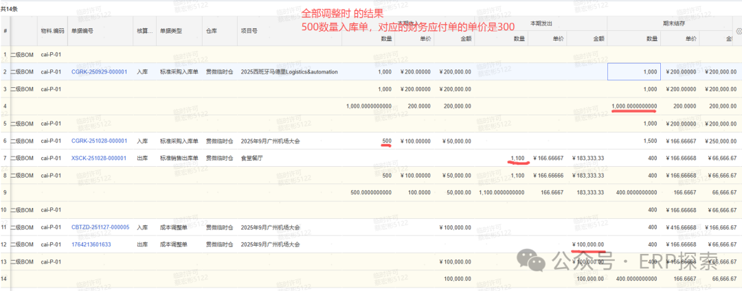 暂估入库数量500对应的入库调整金额是100,000.00,那么出库数量100,应该分摊的调整成本就是500份中的100份: