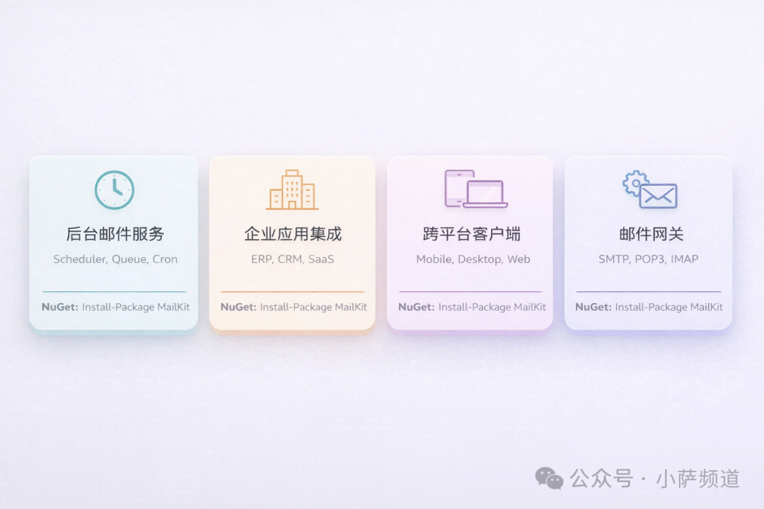 实际项目中什么时候用它后台邮件服务:定时任务发送通知邮件、批量发送营销邮件、收件解析做自动化处理。MailKit 的 PIPELINING 和流式处理让性能有保障。 企业应用集成:Exchange / Microsoft 365 的 OAuth2 认证、Shared Mailbox 操作、IMAP ACL 权限管理,S/MIME 加密——这些企业级需求在其他库里要么不支持要么一堆 workaround。 跨平台客户端:Xamarin、MAUI、Uno Platform 开发桌面或移动邮件客户端,MailKit 是目前移动端最稳定的 IMAP/SMTP 实现。 邮件网关或代理:需要解析 MIME 内容、验证 DKIM、处理 TNEF(Winmail.dat)格式的附件,MimeKit 的 MIME 解析能力在这些场景下是核心依赖。