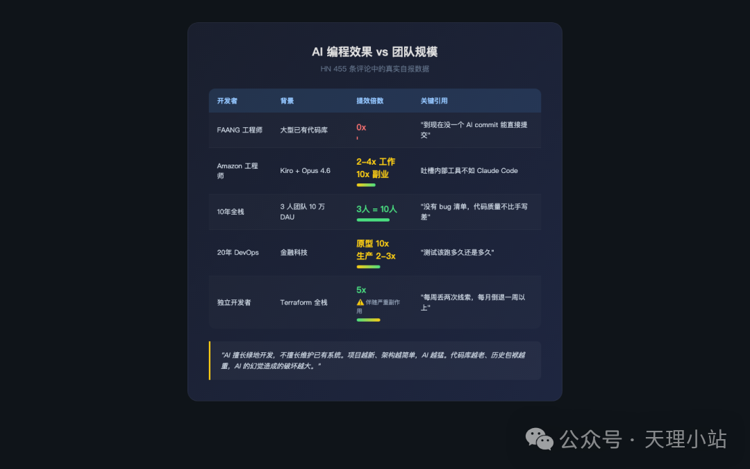 二、大厂 0 收益,小团队 10 倍——真实数字HN 455 条评论里最出乎意料的发现:AI 编程的效果跟团队规模严重相关,而且几乎是反过来的。 先看真实自报数据: