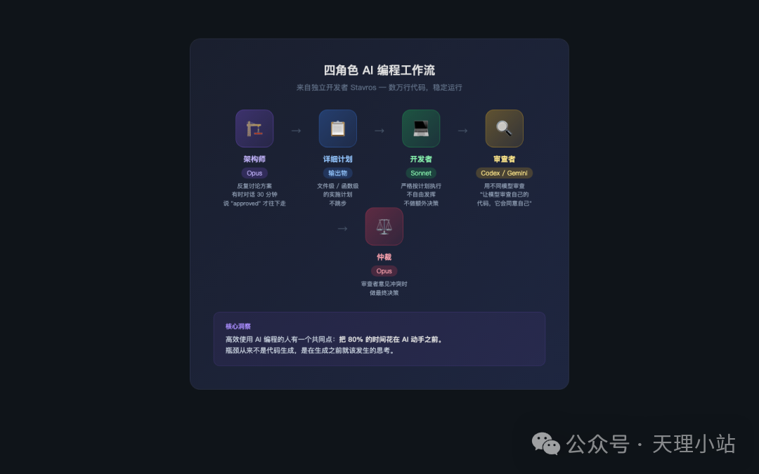 有人回复点出了两难:"要么他们是对的(100% AI 代码很快实现),那你反正要失业。要么他们是错的,但到那时候聪明人早走光了。你能看到第三种未来吗?" 六、真正高效的人在做什么?同样是用 AI,为什么有人体验 10x,有人体验 0? 独立开发者 Stavros 在博客上分享了他的工作流——用 AI 构建了多个产品,数万行代码,稳定运行。秘诀不是"更好的 prompt",是一套四角色分工: