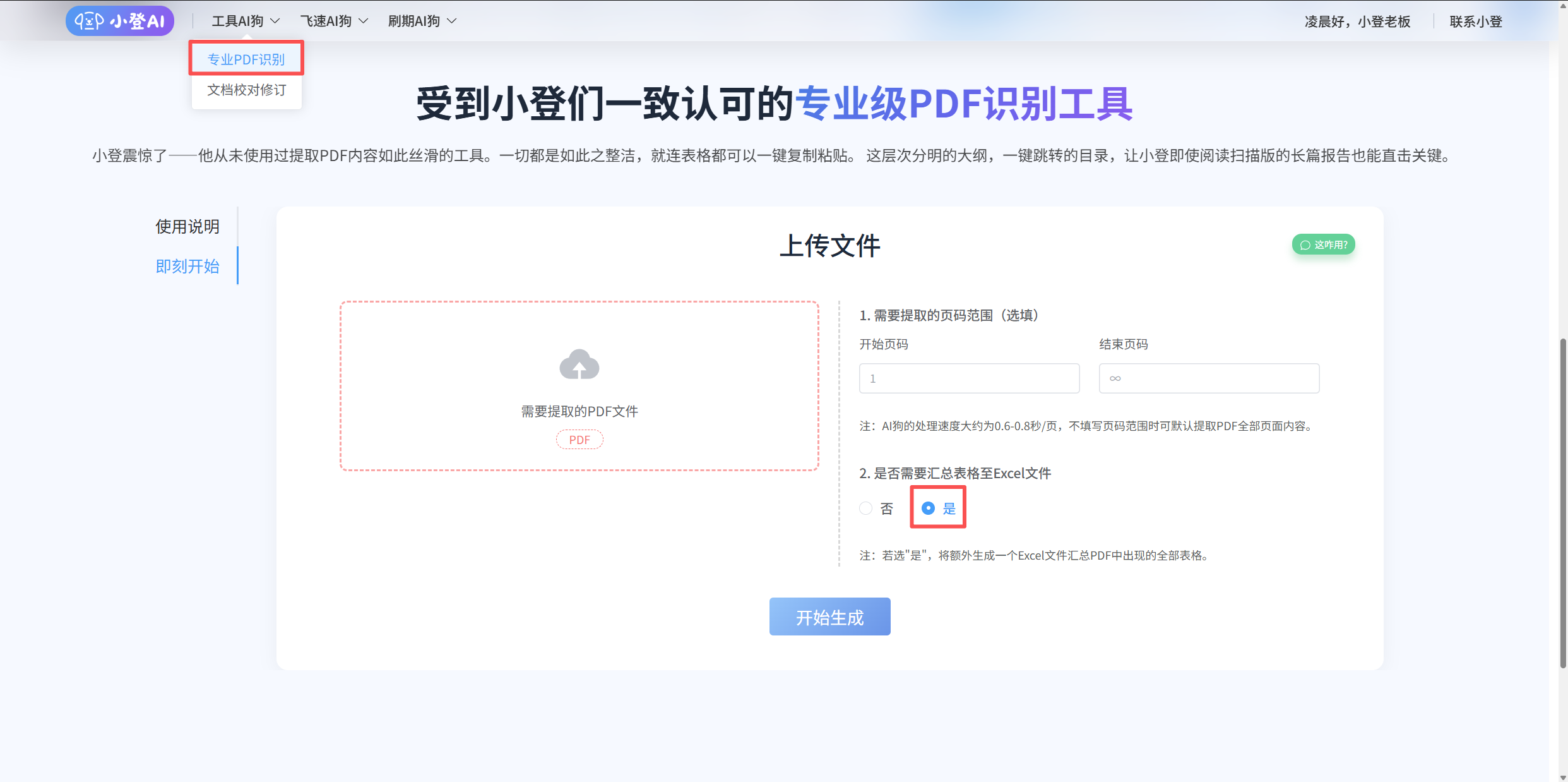 ▲审计报告 - 财务报表附注里面随便找的一页 02 — 怎么用 如下图,在“工具AI狗”下拉菜单中找到“专业PDF识别”模块,上传PDF文件,点击“开始生成”。 ▲功能页面