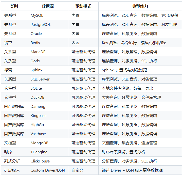 对于开发者和 DBA 而言,一款高效、轻量、兼容多数据源的数据库客户端,能极大提升日常工作效率。市面上多数客户端要么高级功能需要付费,要么基于 Electron 架构,存在体积大、资源占用高、启动慢等问题。