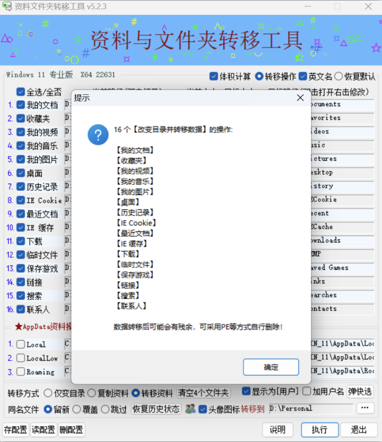 01 聊一聊 今天给大家分享一款文件夹转移工具。 附件:Windows系统资料文件夹转移工具V5.2.3.rar 02 软件介绍 这是一款绿色单文件小工具,体积仅有 548K,非常小巧轻便。 它可以一键将「我的文档」「收藏夹」「我的视频」「我的音乐」「桌面」「临时文件」等系统目录,转移到非系统盘。 ![]() 默认会转移到 D 盘,如果你想换到其他盘,点击右下角的三点按钮,选择目标文件夹即可修改。 ![]() 工具提供三种转移方式:仅变目录、复制资料、转移资料。 「仅变目录」只修改文件夹的链接指向,「复制资料」会在新位置复制一份,原文件保留不删除。 ![]() 转移完成后,会显示完整的文件转移信息。 ![]() 该文章在 2026/4/24 10:57:56 编辑过 |