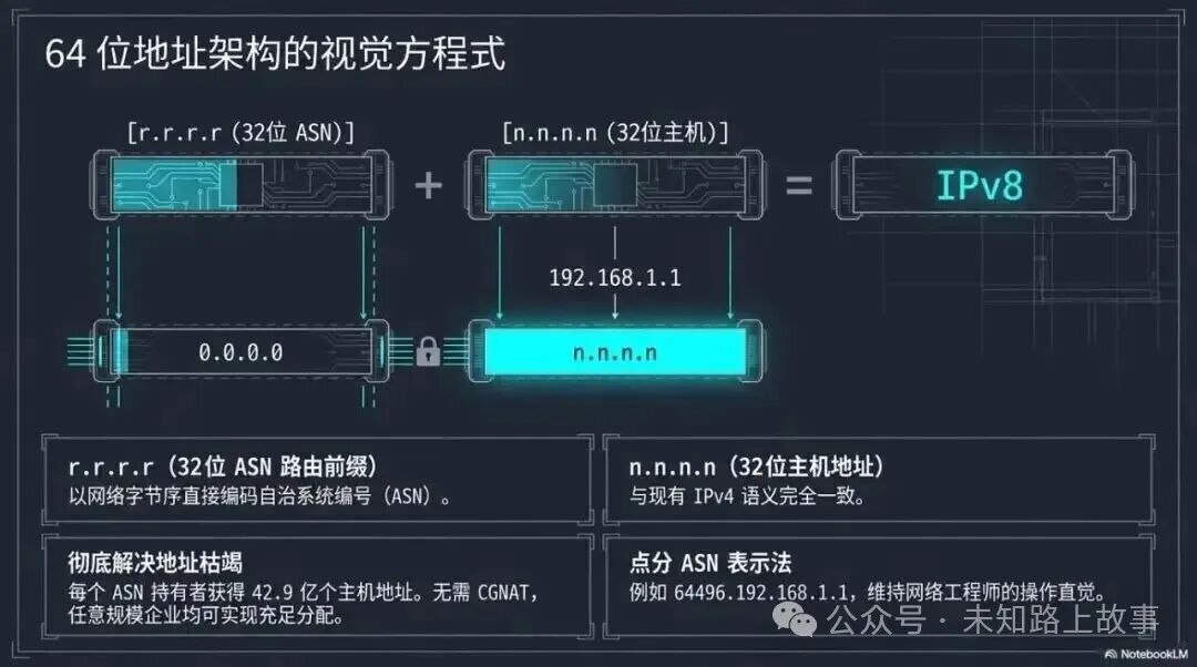 IPv4 的地址池 2011 年就分完了,现在全靠 NAT  和 CGNAT 续命。CGNAT 会增加延迟,会让 P2P 协议失效,排查问题也更麻烦。IPv8 给每个 ASN 分了 2 的 32 次方个主机地址,也就是 42 亿个,随便用。