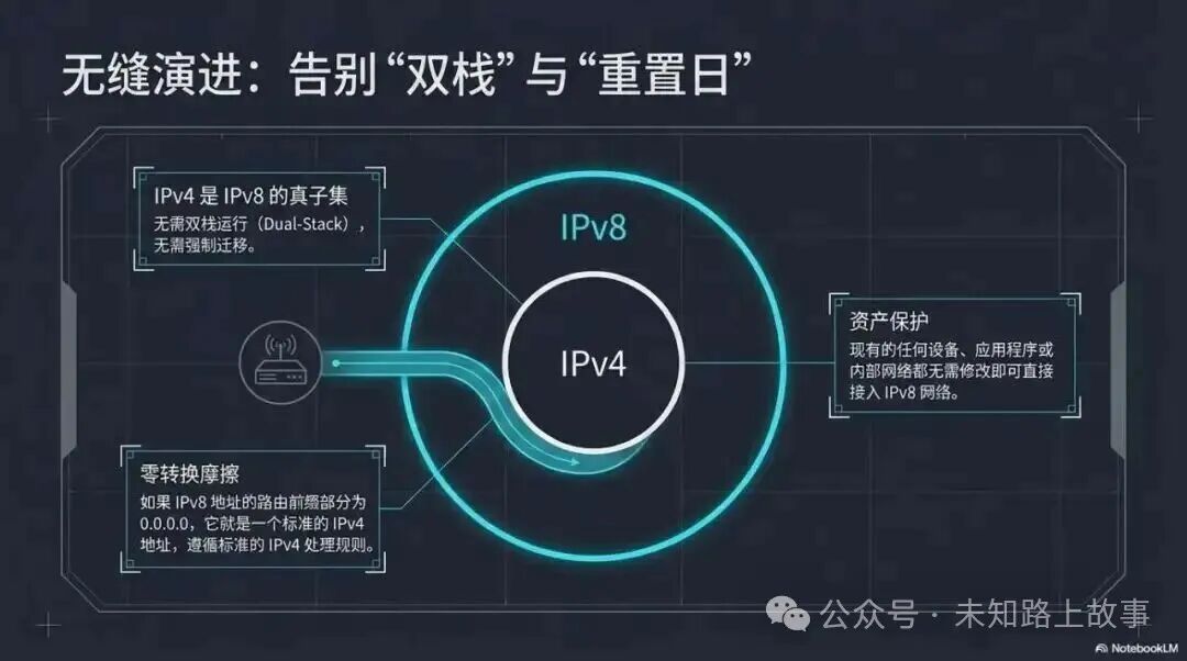 这意味着什么?旧设备不用改,旧应用不用动,不需要双栈,没有强制迁移的时间节点。