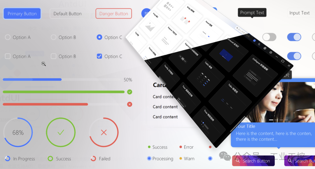 啥意思?就是用代码直接画界面,不依赖任何图片资源。以前想让按钮好看点,自己画,要么切一堆图片往资源里塞。现在控件本身就是矢量渲染的,可以任意缩放、支持高清屏、不会出现模糊。 动画效果体验顺滑。 很多 WinForm 控件库的动画是硬切的,或者干脆不给动画。 AntdUI 的控件支持动画,而且是能打断的舒适动效。比如按钮的悬停效果、下拉菜单的展开收起,都有过渡动画。而且动画过程中如果你再次操作,它会自然响应,不会卡住或者闪烁。 黑白模式主题自动切换。 今天很多应用都支持深色模式,用WinForm 原生控件想实现这一点,得自己写一堆逻辑。 它直接内置了主题配置,支持浅色和深色模式,而且可以跟随系统自动切换。你不需要额外处理颜色适配,控件会自动根据当前主题调整配色。