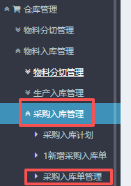 操作步骤:仓库管理——物料入库管理——采购入库管理——采购入库单管理;进入页面如下图所示: