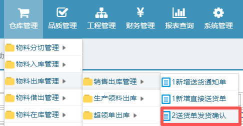 操作步骤:仓库管理——物料出库管理——销售出库管理——送货单发货确认;进入页面如下图所示: