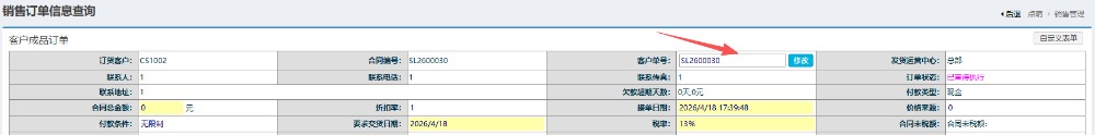 选中对应的单据,点击“查看”按钮;进入下图所示页面:双击“客户单号”位置,如下图所示: