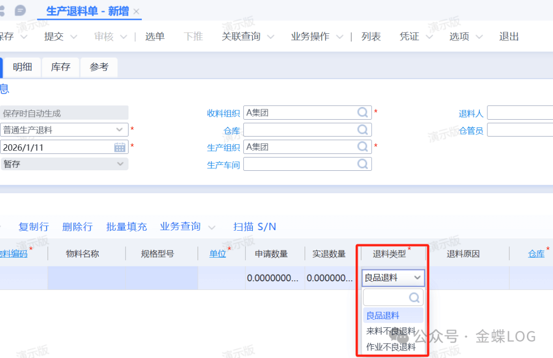 问题描述平时在进行生产退料的时候,单据上有个退料类型字段:“良品退料”、“来料不良退料”和“作业不良退料”,它们分别表示什么意思?学完本篇文章,您将学会:①生产退料单【退料类型】的作用。②不同退料类型对生产用料清单的影响③如何默认【来料不良】和【作业不良】库存状态​ A问题解答一、不同退料类型的作用①良品退料场景一:...