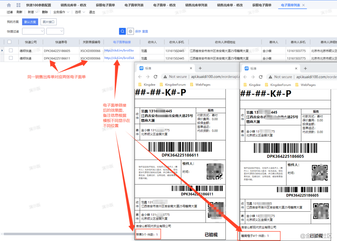 金蝶云星空领域的销售模块集成了快递100对接功能,默认适用于销售订单,发货通知单,销售出库单和销售退货单(下文将这四种单据引用为销售单据)。通常客户一般是用一张销售单据去申请一次快递100电子面单,这样就能保证一张销售单据有一个快递100单号的回填,即通常销售单据上的物流跟踪页签中有且仅有一个物流单号,如下图1-1所示...