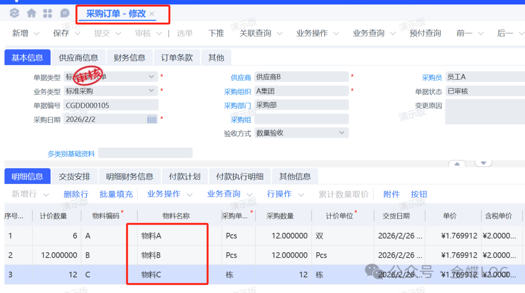 Q问题描述采购订单有三行物料,可以作废或删除其中一行吗?学完本篇文章,您将学会:①订单作废按钮的生效范围②已审核没有下游的删除方式③已审核且有下游的删除方式​ A问题解答一、订单作废按钮的范围订单的【作废】按钮在单据头上,所以一旦点击【作废】,生效范围是整张单据。没有办法只作废单据的其中一行。二、已审核没有下游如何删...