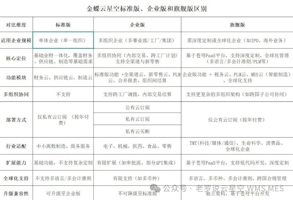 ​金蝶云星空标准版、企业版、旗舰版区别1.适用企业规模:标准版用于单体企业、企业版用于多组织企业、旗舰版用于需深度定制或全球化企业(如IPO、海外业务)和需要AI功能。2.核心定位:标准版:基础业财一体化,覆盖财务供应链、制造等基础需求;企业版:多组织协同(内部交易、跨工厂计划)支持全渠道与新零售;旗舰版:基于苍穹Pa...