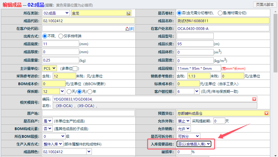 原材料采购入库为待品检状态,怎么关闭此功能,将物料自动作为合格品入库?以管理员或有权限身份进入ERP系统-》系统管理-》物料管理-》物料信息维护:找到此物料:在物料基础信息维护中,找到“入库需要品检”,改为:“否(已合格品入库)”,以后此物料采购入库时,就会自动标记为合格品,不会生成待品检单了。
