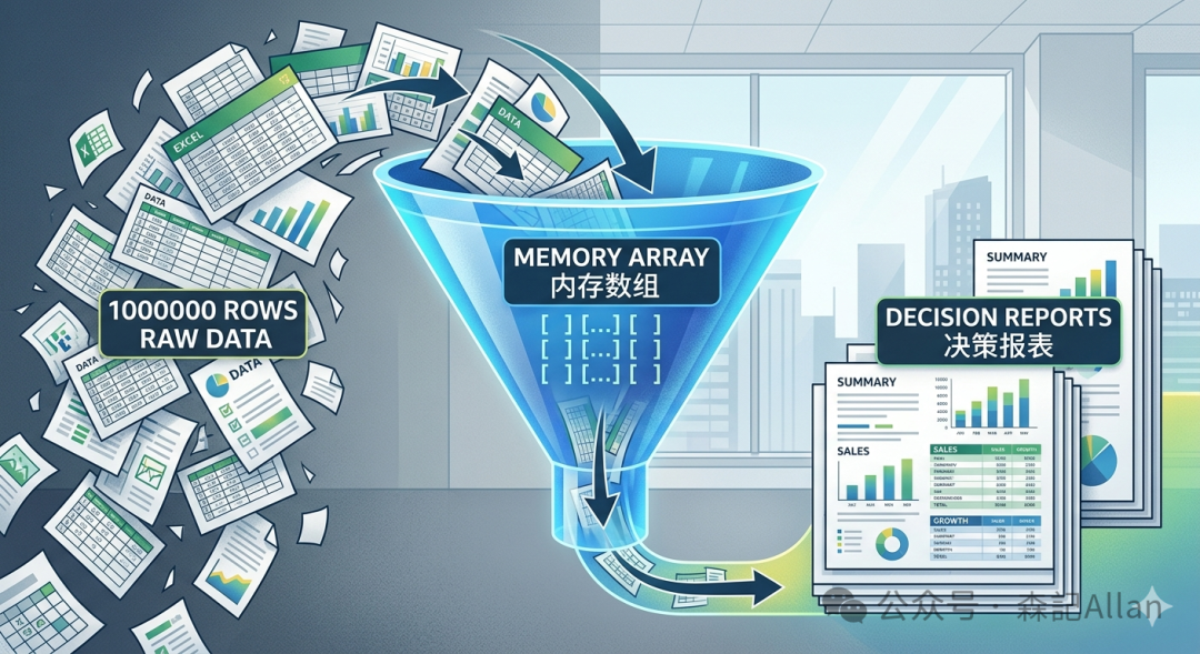 前言:被误解的VBA与消失的生产力在数字化转型的浪潮,许多管理者常面临一个尴尬的悖论:坐拥昂贵的硬件设备,却在处理百万行级别的Excel报表时,被迫面对长达数分钟的「程序未响应」。传闻「Excel承载不了大数据。」其实并非工具的局限,而在于『法门』的优劣。真正的效率从不与单元格「肉搏」,而是通过内存数组实现对数据的降维...