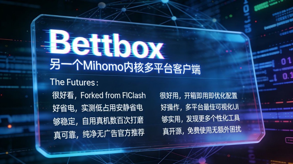 🌐Bettbox-基于Mihomo内核的多平台代理客户端(https://github.com/appshubcc/Bettbox)▎软件平台:#Windows#macOS#Linux#Android▎软件介绍:一款基于Mihomo内核开发的多平台代理客户端,根据FlClash早期版本进行重构,主打开箱即用与丝滑体验...