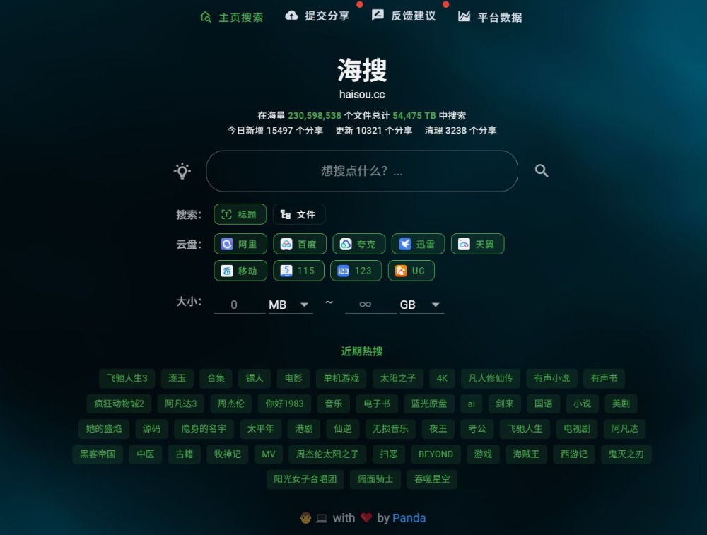😞海搜,在线多网盘资源搜索引擎一个无需登录的网盘搜索网站,也是一个小说搜索神器,支持对各种类型的热门全本小说进行免费搜索,一次搜索多平台结果聚合。收录超过2.12亿个文件,总计52860TB数据,主要是帮你找到阿里、百度、迅雷、天翼、夸克、UC等9个网站上的文件,只需输入名称,点击搜索即可,搜索结果只保留有效,按时间...