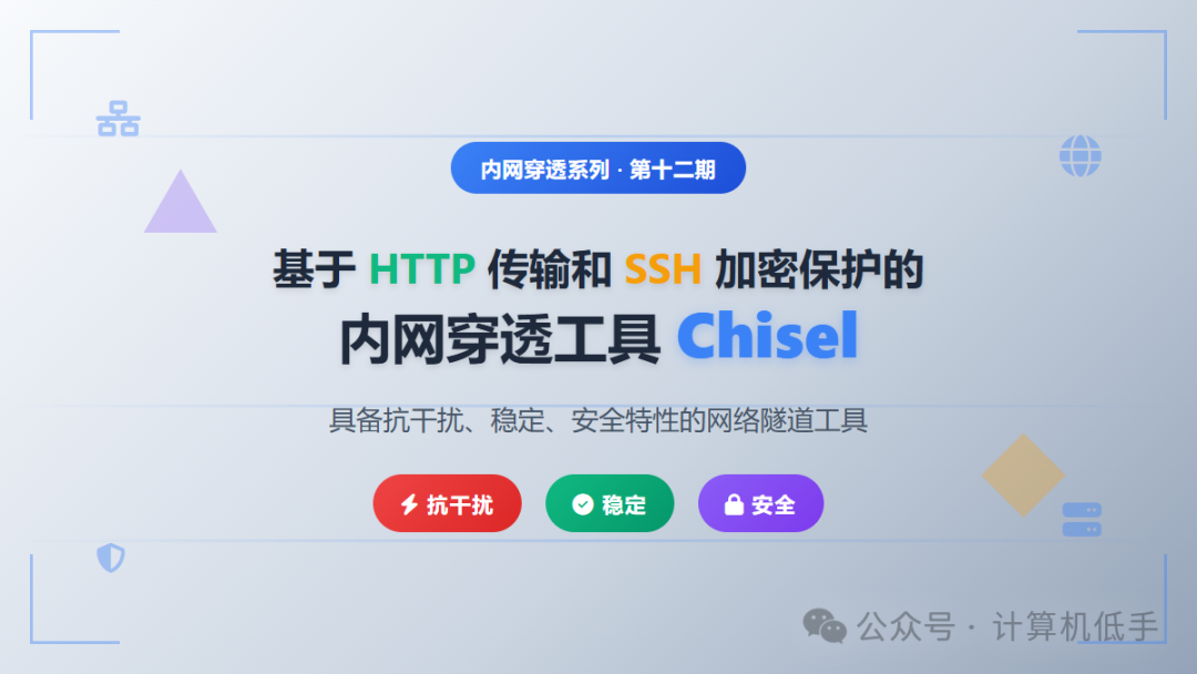 ​一、简介•Chisel是一个易于使用、高效、稳定、安全的内网穿透工具•可以穿透转发TCP/UDP协议相关的服务,通过HTTP传输,并通过SSH进行数据加密保护•单一可执行程序,支持多种操作系统快速安装,也提供Docker镜像•开源地址参考:https://github.com/jpillora/chisel•C/S架...