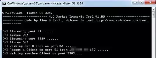然后在公网的机器上:Lcx.exe –listen 监听51端口,转发到公网机器的3389端口