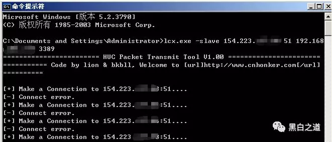 例如:lcx.exe –slave 154.223.*.* 51 192.168.*.* 3389 将内网的3389端口转发到公网的51端口
