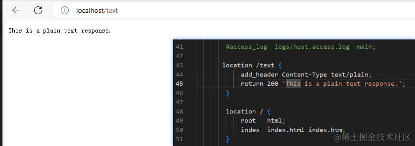 尝试修改配置:D:\Software\nginx-1.24.0\confi\nginx.conf 添加一个文本返回