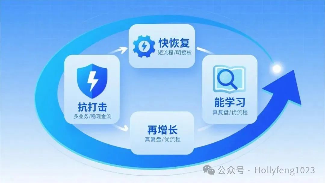 组织韧性绝不是“死扛”或“裁员断臂”。它是一种让企业能在危机中活下来,并在危机后变得更强大的动态能力。我把它总结为一个四步循环:“抗打击 → 快恢复 → 能学习 → 再增长”。