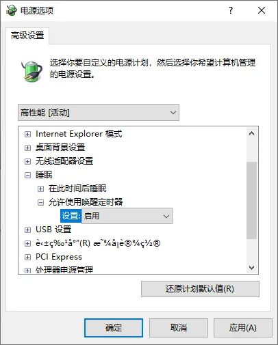 点击「更改计划设置」-「更改高级电源设置」,展开「睡眠」-「允许使用唤醒定时器」,将「电池」和「接通电源」都设置为「启用」