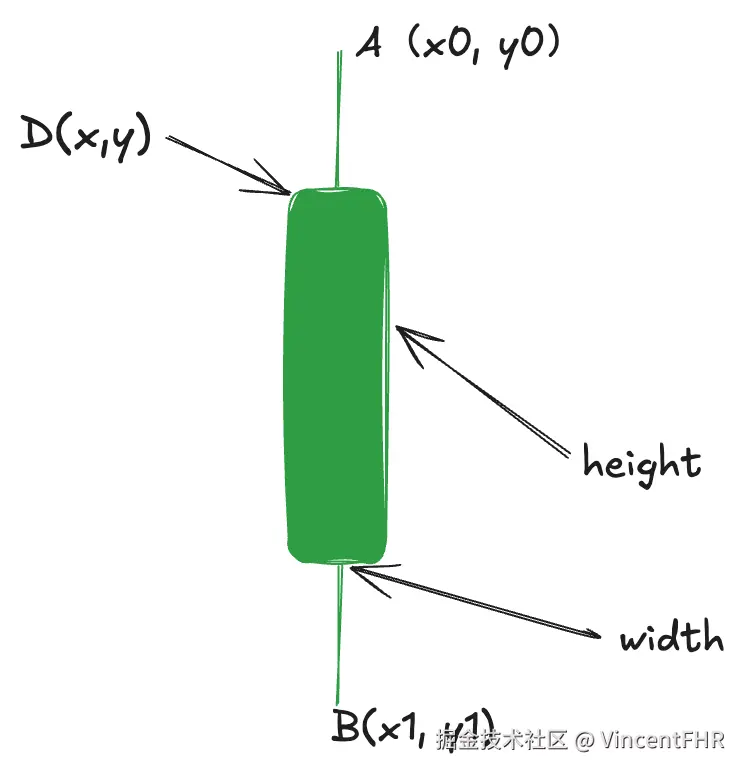 为了方便样式自定义, 我独立出一个默认的配置对象 defaultKlineConfig, 参数的含义如下图所示,其实下图这个风格的标注, 是通过 excalidraw 这个软件画的, 也是 canvas 做的开源软件, 可见 canvas 在前端可视化领域的重要性, 这个扯远了,打住。