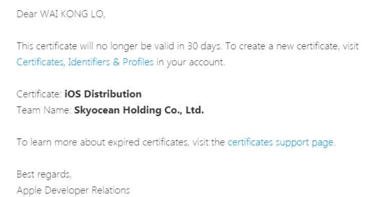 在距离distribution 证书过期一个月(或被手动revoke了)的时候会收到apple的邮件
